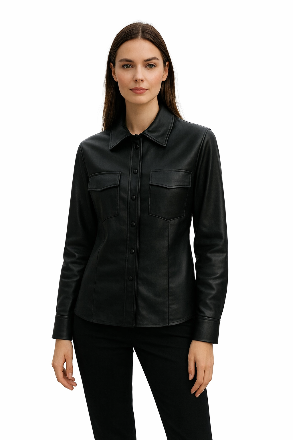 Camisa estruturada de manga longa, fechamento frontal por botões e bolsos no busto. Confeccionada em couro sintético (PU), com acabamento liso e caimento ajustado, ideal para looks modernos e elegantes.